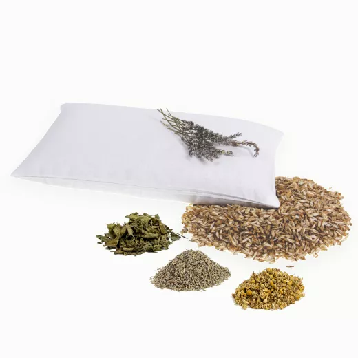 Im Inneren des Kissens befinden sich handverlesene Kräuter und hochwertige Dinkelspelzen: