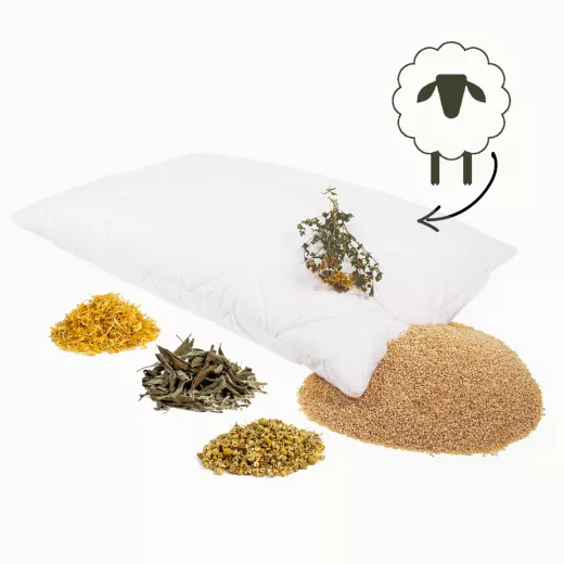 Die Füllung besteht aus kuscheligen Bio-Hirseschalen, die sich angenehm an die Schlafposition anpassen, kombiniert mit einer sorgfältig ausgewählten Kräutermischung. Johanniskraut, echte Kamille, Ringelblume, Melisse und Salbei ergänzen das Kissen auf natürliche Weise und machen es zu einem liebevollen Begleiter für erholsame Nächte. Ein Kissen, das Geborgenheit und natürlichen Komfort vereint.