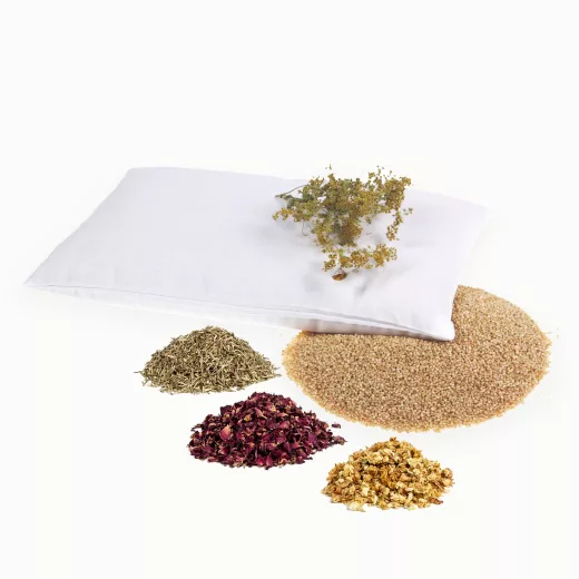 Die Füllung aus weichen Bio-Kuschelhirseschalen wird durch eine besondere Frauen-Aromamischung ergänzt: Sorgfältig ausgewählte Yasminblüten, Rose, Frauenmantel und Eisenkraut verleihen dem Kissen eine feine, natürliche Duftnote und machen es zu einem besonderen Begleiter für entspannte Momente.