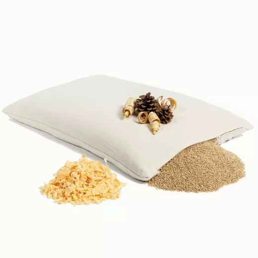 Vermengt mit feinkörnigen Bio-Hirseschalen aus kontrollierten österreichischen Mühlen, sorgt die Füllung für eine angenehme Luftzirkulation und eine ausgeglichene Liegeposition ohne Hitzestau. Die doppelt entstaubte und gereinigte Hirse schmiegt sich sanft an und enthält 90 % Kieselsäure – für ein rundum natürliches und komfortables Liegegefühl.