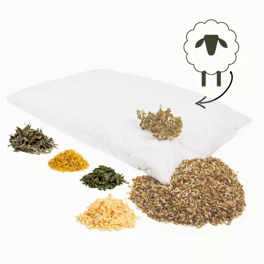 Handvermengt mit einer erlesenen Kräutermischung aus Haferkraut, wildem Thymian, Ringelblume, Gebirgsarnika, Löwenzahnwurzeln, Zinnkraut und Salbei bietet dieses Kissen eine kraftvolle Verbindung aus Natur und Komfort. Die Blüten des Holunderbusches verleihen eine besondere Note, während erfrischende Minze die Mischung abrundet. Ein Kissen für all jene, die auf natürliche Weise Kraft tanken und sich eine erholsame Schlafumgebung schaffen möchten.