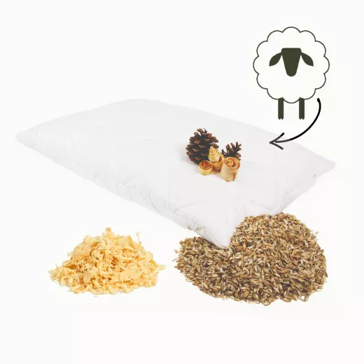 Ergänzt wird das Schafwollkissen durch naturbelassene Zirbenflocken, die dezent und unbeduftet sind, um Allergien oder Nebenwirkungen zu vermeiden. Diese werden von Hand mit un-gekreuztem, artenreinem Dinkelspelz vermengt. Der Dinkelspelz bietet eine kompakte Stütze für die Wirbelsäule, ist anpassungsfähig und durch seine reichhaltigen Inhaltsstoffe besonders wertvoll. Die spezielle Beschaffenheit der Spelzen kann eine effektvolle Massage des Bindegewebes ermöglichen, was das Kissen wohltuend fest und dennoch nachgiebig macht.