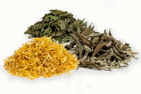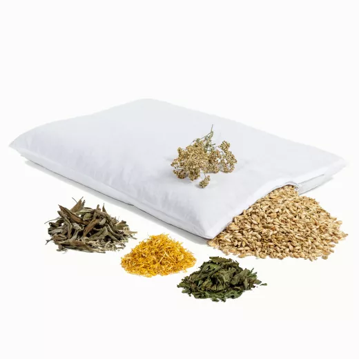 Handbefüllt mit naturreinen Kräutern, Schafgarbe, wilder Thymian, Salbei, Minze, Gebirgsarnika, Löwenzahnwurzeln und Zinnkraut. Vermengt mit BIO-Dinkelspelzen, das Urkorn der hl. Hildegard von Bingen.