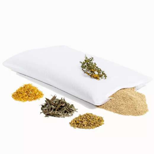 Kuschelig weiche Hirseschalen aus BIO Anbau sanft vermengt mit spezieller heile Segen Kräutermischung: Johanniskraut, echte Kamille, Ringelblume, Melisse und Salbei.