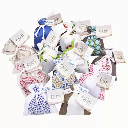 In unserer hauseigenen Produktion werden die Säckchen je nach Verfügbarkeit der Stoffe in aufwendiger Handarbeit gefertigt und liebevoll befüllt. Ihre Bestellung erhalten Sie in einer abwechslungsreichen Farbmischung, die sich aus unserem aktuellen Lagerbestand ergibt.