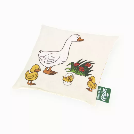 Wie viele Küken hat Mama Gans? Beim Zählen und Benennen der kleinen Tiere werden spielerisch die Sinne angeregt. Dieses liebevoll gestaltete Kissen fördert nebenbei den pädagogischen Lerneffekt, indem es Kinder dazu einlädt, Tiere zu erkennen und zu benennen. Gleichzeitig schafft es wertvolle Momente der Zwiesprache und Zuwendung – für Geborgenheit und vertraute Rituale.