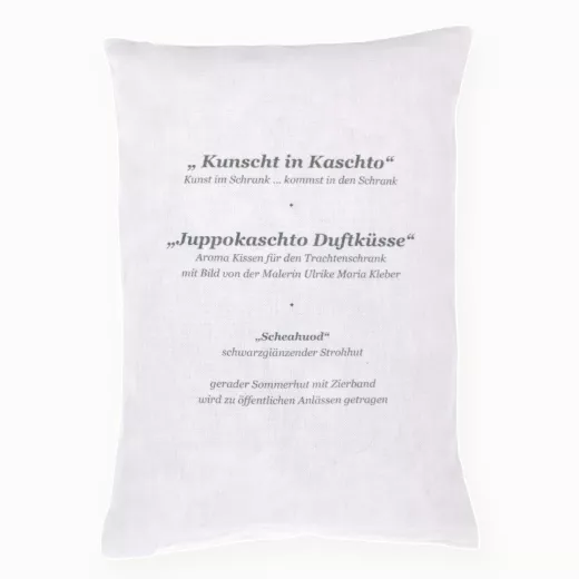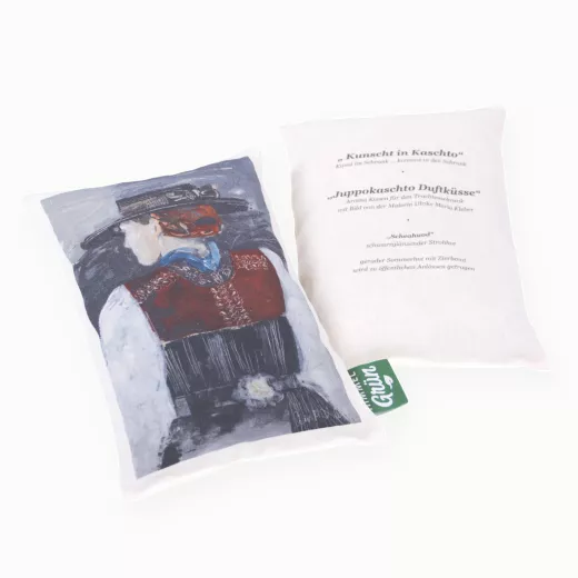 Aromakissen für den Kleiderschrank mit einem Bild der Malerin Ulrike Maria Kleber. Abgebildet ist eine Bregenzerwälderin in ihrer traditionellen Tracht und dem Scheahuod, einem schwarzen, noblen Strohhut, den die Jüpplerin im Sommer trägt – sei es auf Reisen oder zu Besuchen.