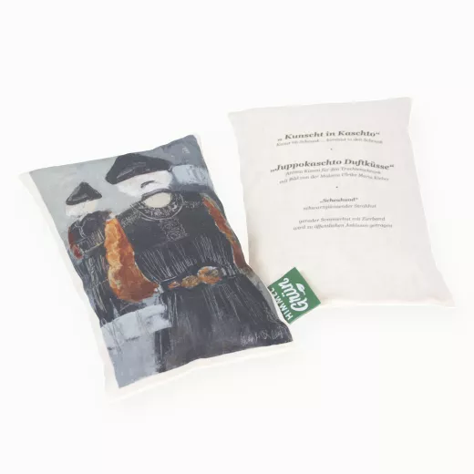 Aromakissen für den Kleiderschrank mit einem Bild der Malerin Ulrike Maria Kleber. Abgebildet sind zwei Bregenzerwälderinnen in ihrer traditionellen Tracht mit Spitzkappe, einer gestrickten, gebürsteten Kopfbedeckung mit 12 weißen Punkten (die 12 Apostel), die ausschließlich zum Gottesdienst getragen wird.