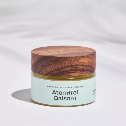 Unser Atemfrei Balsam wird in recyceltem Glas mit einem Holzdeckel und einer Korkeinlage geliefert – eine umweltfreundliche und ansprechende Verpackung, die perfekt zu der natürlichen Pflege passt. Für eine nachhaltige und wohltuende Anwendung.