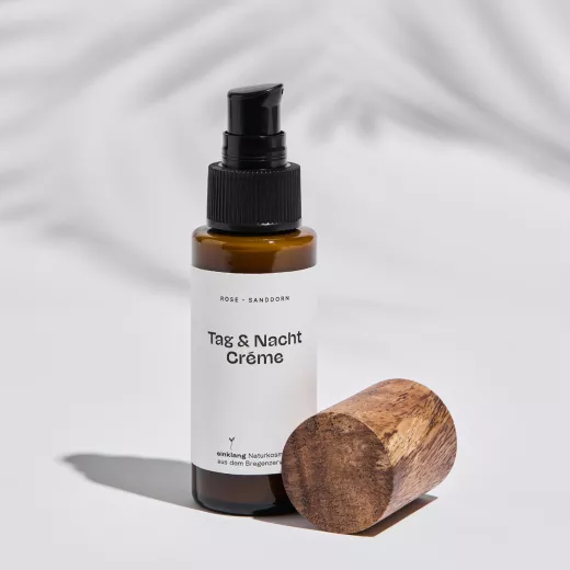 Unsere Tag- und Nachtcreme wird in einem umweltfreundlichen Glasbehälter geliefert, der aus recyceltem Glas besteht. Der Holzdeckel mit Korkrand rundet das nachhaltige Design ab und sorgt dafür, dass du sowohl Haut als auch Umwelt etwas Gutes tust.