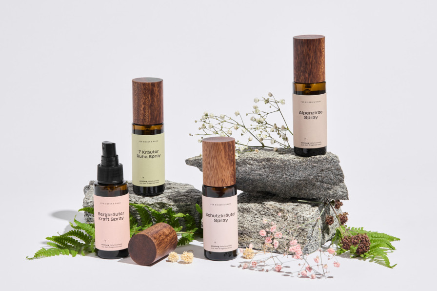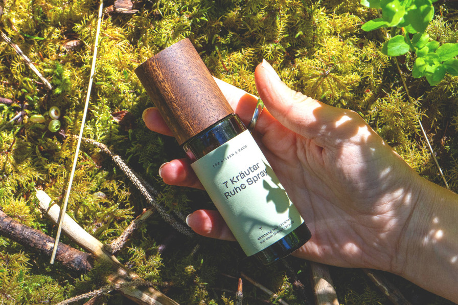 Das 7 Kräuter Ruhespray kommt in recyceltem Glas, mit einem Holzdeckel und Korkrand – eine umweltfreundliche und stilvolle Wahl für natürlichen Duft und nachhaltige Pflege.
