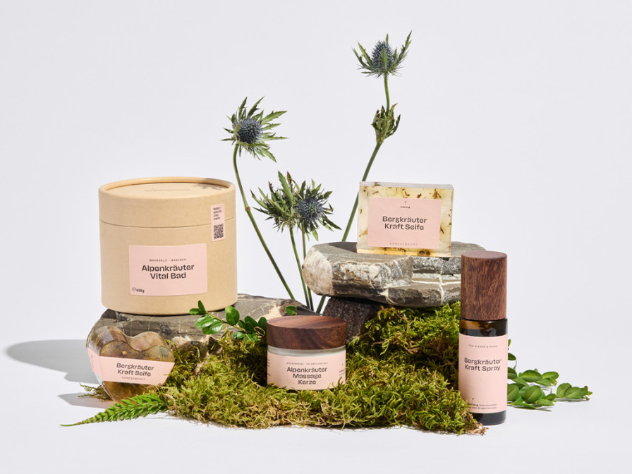 Das Bergkräuter-Kraft Spray ist in recyceltem Glas verpackt, mit einem Holzdeckel und Korkrand – eine umweltfreundliche und stilvolle Wahl für frischen Duft und nachhaltige Pflege.