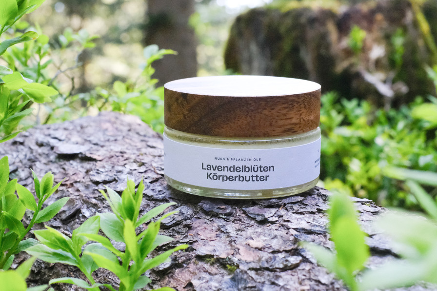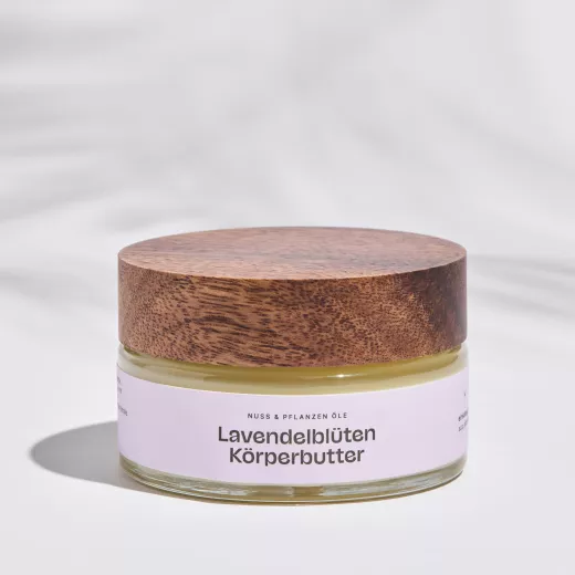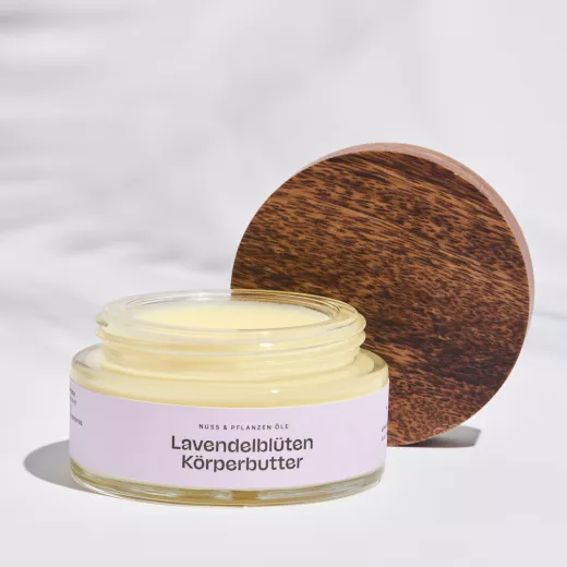 Die Lavendelblüten Körperbutter wird in recyceltem Glas mit einem Holzdeckel und einer Korkeinlage geliefert – nachhaltig und stilvoll für dein Badezimmer.