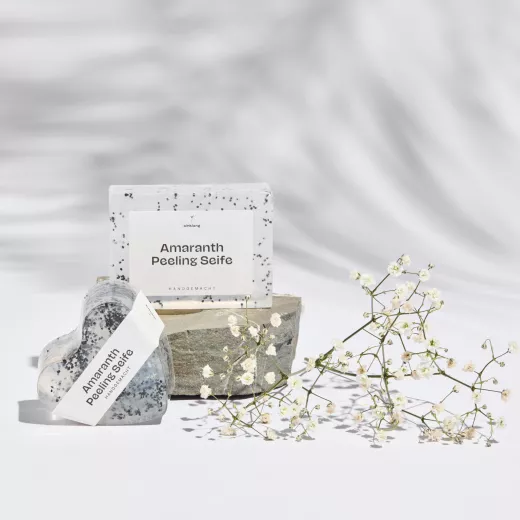 Die Amaranth Peeling Seife ist eine handgemachte Körper- und Handseife, die mit ätherischen Ölen und echtem Amaranth angereichert ist. Amaranth, bekannt für seine positiven Eigenschaften, bietet ein sanftes Peeling, das die Haut auf natürliche Weise von abgestorbenen Hautzellen befreit. Der zarte Duft der ätherischen Öle rundet das Pflegeerlebnis ab und hinterlässt deine Haut geschmeidig und frisch.
