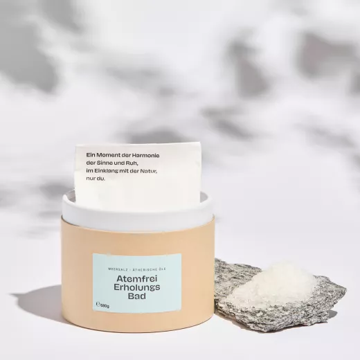 Erlebe pure Erholung und die belebende Kraft der Natur mit unserem Atemfrei Erholungsbad. Hochwertiges Meersalz, reich an Magnesium, Kalzium und Kalium, pflegt deine Haut sanft, während ätherische Öle wie Eukalyptus, Lavendel, Edeltanne und Teebaum deinen Atemwegen wohltun. Genieße ein entspannendes Bad, das Körper und Geist harmonisiert – Naturkosmetik, die durchatmen lässt.