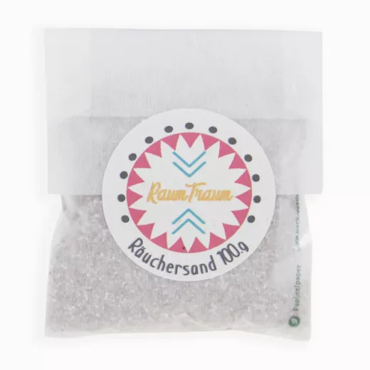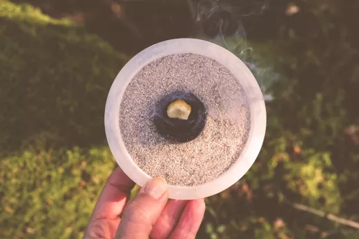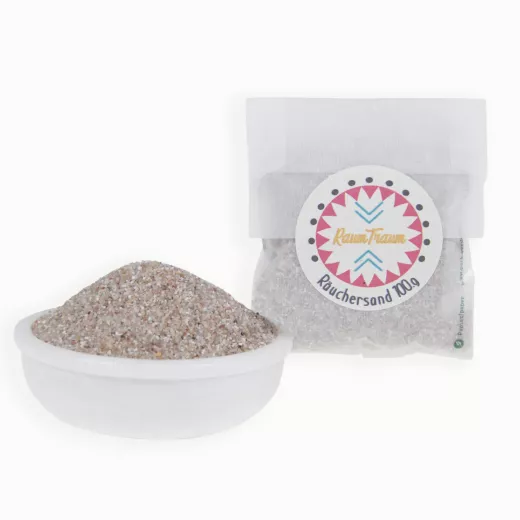 Lassen Sie einen Teil des Sandes in Ihre Räucherschale rieseln, bis der Boden mit Sand gut bedeckt ist. Dann legen Sie die glühende Räucherkohle auf den Sand, um das Räucherwerk oder den Weihrauch behutsam zu räuchern.